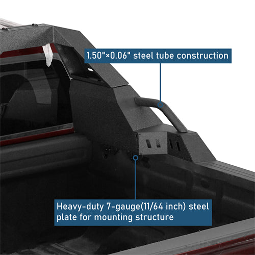 Sturdy Build Quality. Crafted from heavy-duty 14-gauge steel plate and 1.50"×0.06" steel tube, this roll bar is built to withstand tough conditions. The textured black powder coat finish, combined with a premium E-coating process, not only adds to its durability but also provides an appealing aesthetic.