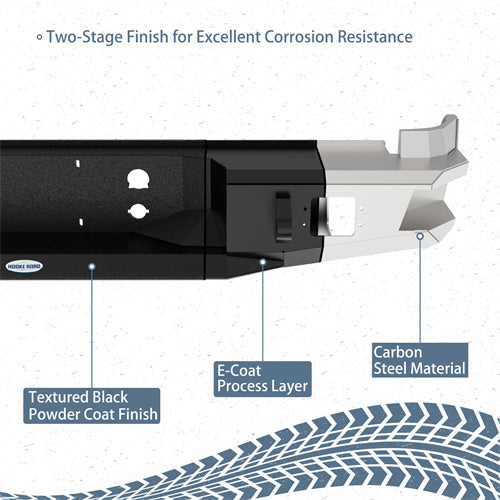 Heavy Duty Construction. Crafted from heavy-duty, high-tensile 11-gauge (1/8 inch) steel the Guardian Ⅱ Rear Bumpermain body, provides robust protection against impacts and wear. Its textured black powder coat finish not only enhances its rugged appearance but also offers excellent corrosion resistance. Inside, the bumper features a premium E-coating process, ensuring long-lasting protection against rust and environmental damage.