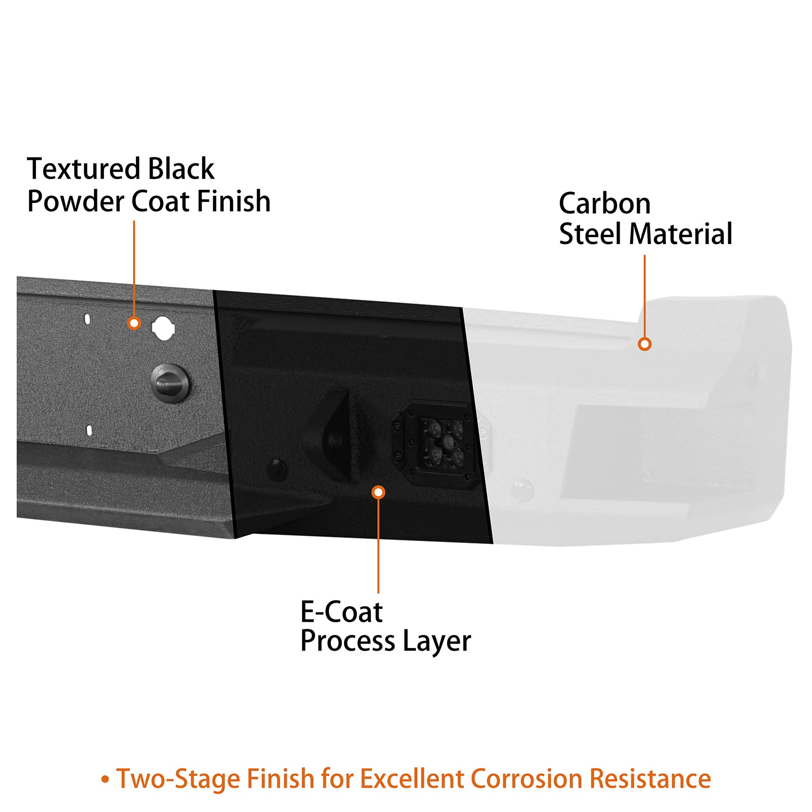 Heavy Duty Construction. The Guardian Ⅱ Rear Bumper is built from heavy-duty, high tensile 11-gauge (1/8 inch) steel for the main body, and 8-gauge (11/64 inch) steel for the mounting structure, ensuring exceptional strength and durability. It features a textured black powder coat finish on the outside, providing a rugged appearance and excellent resistance to corrosion and wear. Inside, the bumper benefits from a Premium E-coating process, offering enhanced protection against rust and environmental damage.