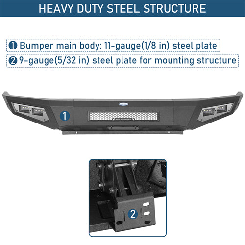 - Heavy-duty 11-gauge(1/8 inch) steel plate for bumper main body, 9-gauge(5/32 inch) steel plate for winch plate and mounting structure