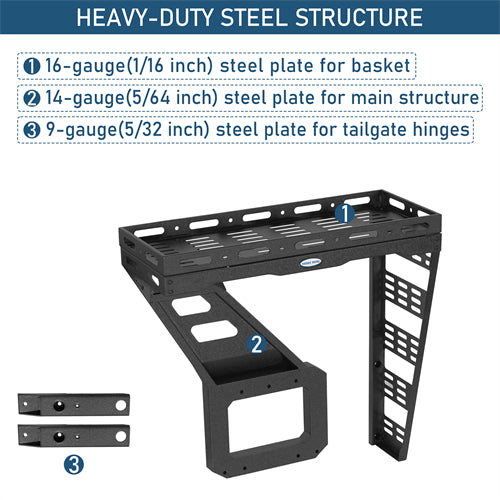 Strong and Sturdy. Built with high-tensile, heavy-duty steel for maximum durability, the Tailgate Basket Cargo Rack utilizes 14-gauge (5/64 inch) steel for the frame, 16-gauge (1/16 inch) steel for the basket, and sturdy 9-gauge (5/32 inch) steel for the hinges. Its textured black powder coat and premium internal E-coating deliver excellent corrosion protection and lasting strength, offering reliable performance and a tough, refined look for your adventures.