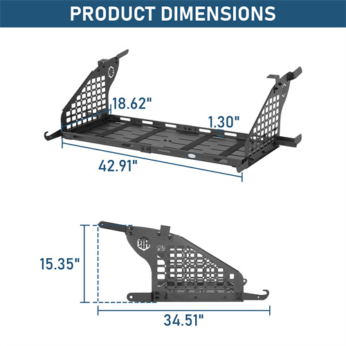 Maximize the Storage Space. The Rear Window Molle Panel & Interior Cargo Rack Kit optimizes rear cargo space by providing versatile storage solutions. It is compatible with MOLLE bags and tool mount clamps. The rack supports up to 65 lbs. EVA foam strips minimize vibration and noise, while an included elastic rope net ensures luggage stays secure. Designed to divide the trunk into two organized sections, this kit helps keep gear clean, neat, and easily accessible for both everyday use and off-road adventures.