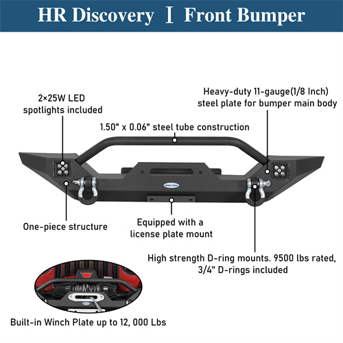 Perfect For Off-Road Use. Featuring two high-strength D-Ring mounts, an integrated winch mount that is capable of supporting a 12,000 lb. winch, and two built-in LED spotlights, the Discovery Ⅰ Front Bumper is perfect for off-road use. Each bumper comes equipped with two 3/4 inch pin d-rings able to handle a load of 9,500lbs making them perfect for recovery.