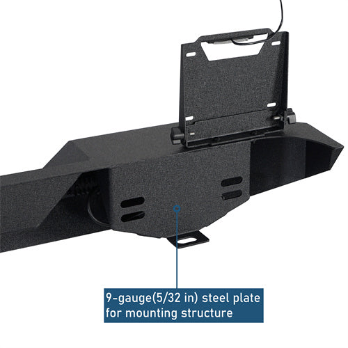 Heavy-Duty Construction. Constructed from heavy-duty, high tensile 11-gauge (1/8 inch) steel for the main body and reinforced with 9-gauge (5/32 inch) steel for the mounting structure, the Classic Rear Bumper is built to withstand difficult off-road conditions. It features a textured black powder coat finish for added durability and corrosion resistance, while the premium E-coating process inside provides long-lasting protection against rust and the elements.