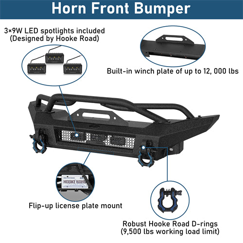 Rugged and Aggressive Look. The Horn Front Bumper is designed to provide your vehicle with a bold, tactical upgrade that enhances both function and appearance. Featuring a stubby design with a tactical tube grille, this bumper maximizes tire clearance for better off-road maneuverability while giving the front end a rugged and aggressive look. Equipped with three 9W white LED spotlights, the bumper provides additional illumination in poor weather or nighttime conditions, ensuring safer off-road adventures. For recovery and utility, it includes a winch plate rated up to 12,000 lbs, completely welded D-ring mounts, and 9,500-lb rated 3/4" D-rings with blue rubber strips. A flip-up license plate mount is also included for road legality, with an optional skid plate available separately for added protection.