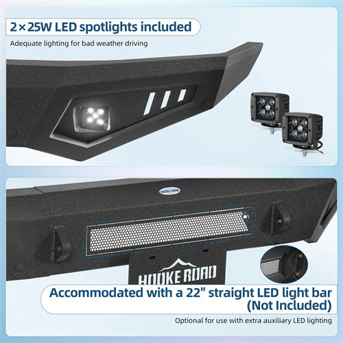 Rugged Styling. The Guardian Ⅰ Front Bumper is a rugged and functional upgrade designed to enhance the look and utility of your vehicle. It comes equipped with 2×25W LED spotlights for improved visibility in low-light conditions and features a stylish honeycomb steel plate design. High-strength D-ring mounts are built in for added recovery capability. The bumper also includes a convenient flip-up license plate mount and pre-cut sensor holes for parking sensors. However, it is not compatible with intelligent cruise control systems.