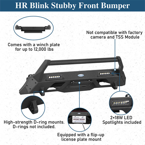 Off-Road Style and Function. The Blink Stubby Front Bumper delivers sharp, aggressive styling combined with functional design, making it a great upgrade for 16-23 Tacoma models. Featuring a low-profile grille guard and clean lines, this bumper is well-suited for both daily driving and light off-road excursions. It includes high-strength D-ring mounts (D-rings not included) for recovery needs, and comes equipped with two powerful 18W LED spotlights, offering enhanced illumination in dark or low-visibility environments. A built-in winch plate, rated up to 12,000 lbs, supports only winches with removable solenoid boxes. Additionally, a convenient flip-up license plate mount is integrated into the design. This bumper is not compatible with TSS sensors or front cameras.