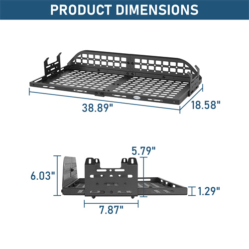Solid Construction. Constructed from strong 14-gauge (5/64 inch) steel plate, this cargo rack is built to deliver lasting durability and dependable performance. The solid steel structure provides excellent strength to support heavy gear and withstand tough conditions. Finished with a durable black powder coat, it resists rust, scratches, and wear, ensuring long-term protection and a sleek, rugged appearance that complements your vehicle’s interior.