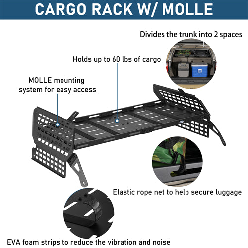 Maximize the Storage Space. The Rear Window Molle Panel & Interior Cargo Rack Kit provides a versatile solution for organizing your rear cargo area, maximizing usable space and keeping gear easily accessible. It works seamlessly with all MOLLE-compatible bags and tool mount clamps, allowing you to secure various items such as trail equipment, recovery tools, small shovels or axes, and everyday accessories. EVA foam strips are included to minimize vibration and reduce noise during driving, while the elastic rope net provides additional security to keep your luggage and loose items firmly in place across rough terrain.