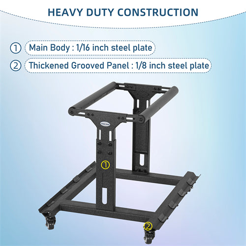 Stable and Lightweight Structure. Crafted with durability in mind, the storage cart features heavy-duty construction using 11-gauge (1/8 inch) and 16-gauge (1/16 inch) steel plates. The textured black powder coat finish not only adds a sleek look but also enhances resistance to corrosion and wear. Additionally, the interior is treated with a premium E-coating process, further enhancing its longevity. The steel material ensures robustness, allowing the cart to support the weight of the doors effectively.