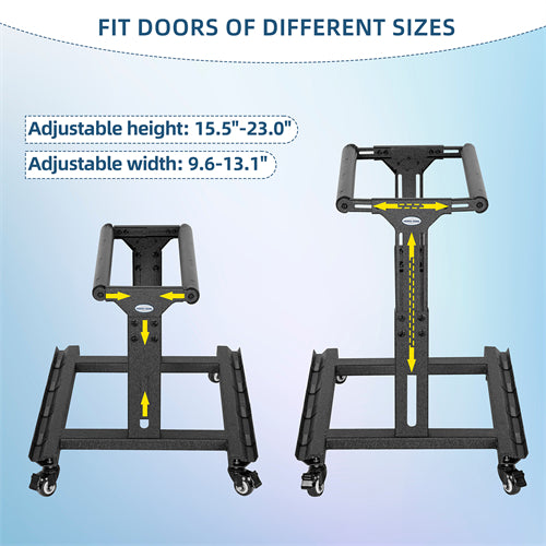 Ingenious Storage Cart Solution. The Doors Storage Cart is a functional and visually appealing solution for storing and organizing your doors. Designed to hold two doors securely, this cart maximizes space efficiency by positioning the doors inclined and facing each other. With an adjustable design, you can easily customize the height from 15.5" to 23.0" and the width from 9.6" to 13.1". This ensures a perfect fit for your specific doors, providing a sturdy and compact storage unit. To protect your doors from scratches and impact, the cart includes thick EVA foam sheets and pipes. This ensures that your doors remain in excellent condition while stored on the cart.