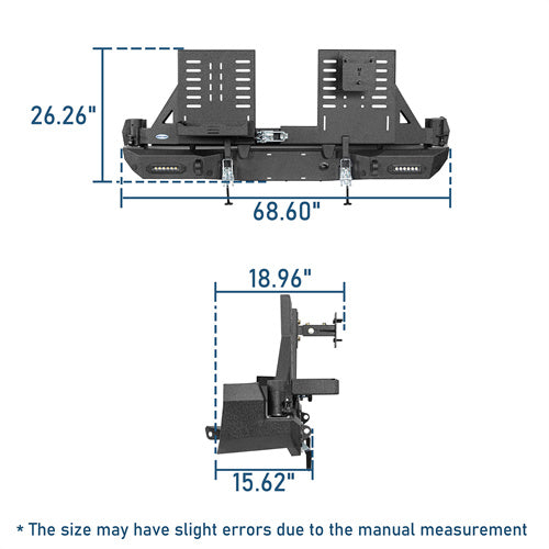 Overland Style and Protection. The Rear Bumper with Dual Swing Arms and 5.3-gallon Jerry Can Holder by is a heavy-duty marvel designed to provide exceptional rear-end protection for your Tacoma. Its robust structure not only ensures durability but also exudes a rugged aesthetic. The bumper is equipped with 2×18W single-row LED spotlights, offering both functionality and a striking appearance. The inclusion of high-strength D-ring mounts, license plate mounting options, and compatibility with factory features like the hitch receiver and back-up sensors showcases the bumper's versatility and attention to detail.