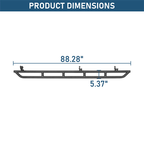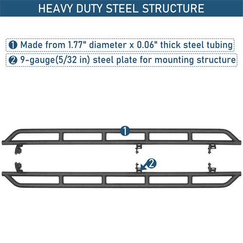 Heavy Duty Construction. Constructed from 1.77" diameter × 0.06" thick steel tubing with a 9-gauge (5/32 in) steel plate for the mounting structure, these rocker guards provide exceptional strength and durability. The textured black powder coat finish, combined with a premium internal E-coating process, ensures long-lasting corrosion resistance and a rugged, off-road-ready appearance.