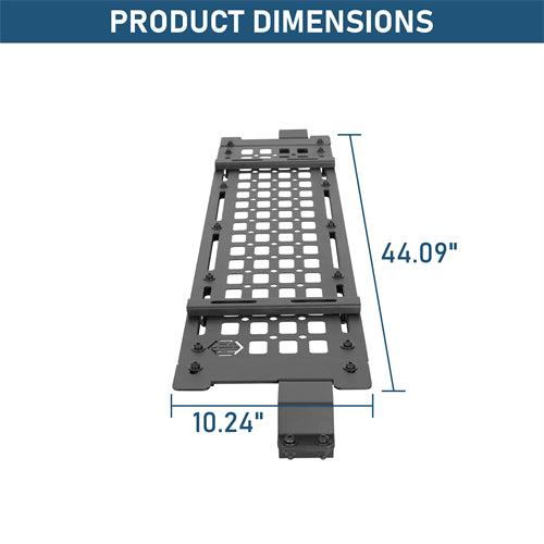 Utility MOLLE Panel. The Trunk Roll Bar Mount MOLLE Panel Utility Rack maximizes storage by utilizing the entire upper trunk area. Its tactical MOLLE panel design allows easy attachment of pouches and gear, helping you neatly organize essentials like shovels, flashlights, ropes, and bags. Items can be stored and accessed with ease, while the two vertical bars provide secure mounting for additional equipment. Perfect for overlanding, this rack lets you carry more tools and gear for long-distance adventures.