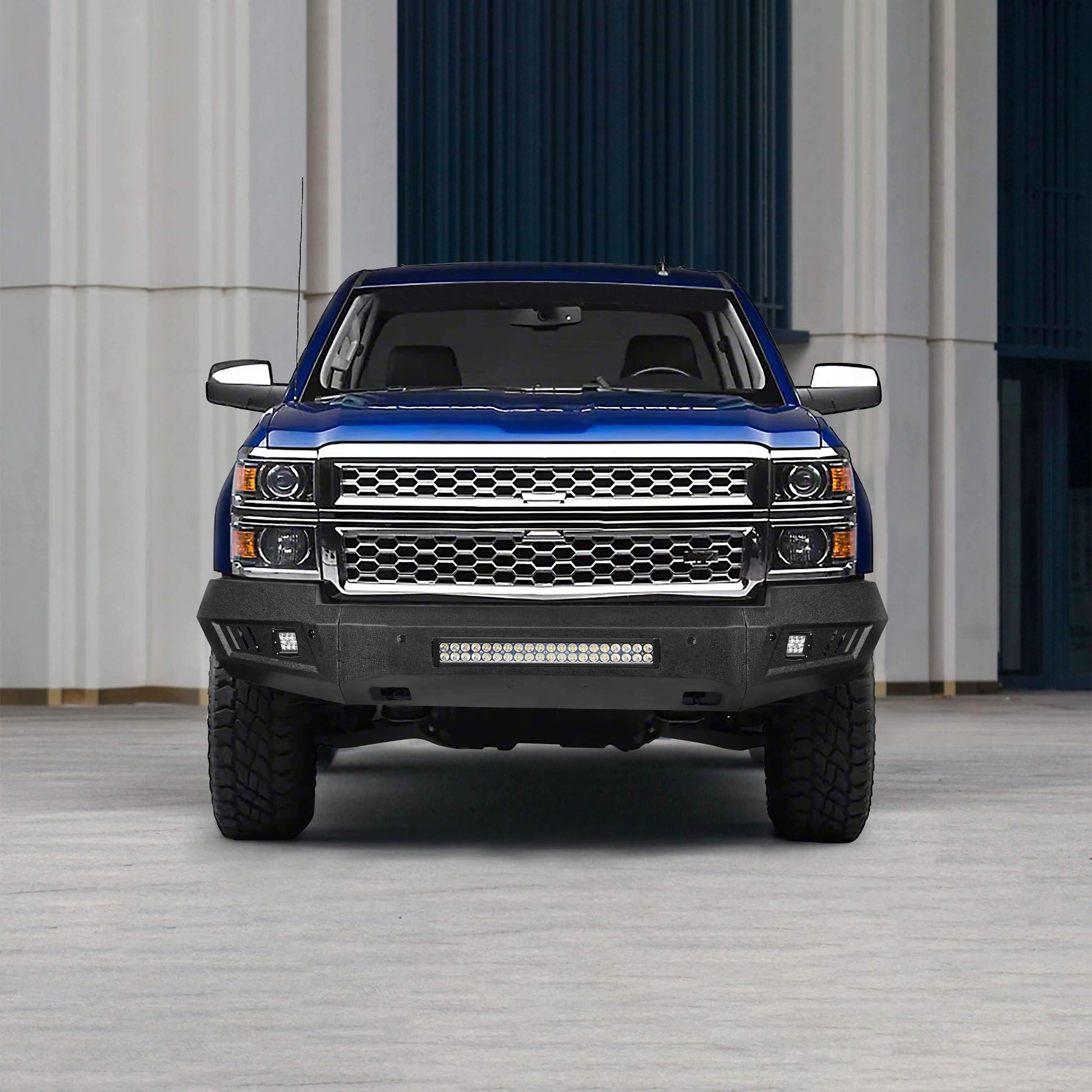 Fits 2014-2015 Chevy Silverado 1500 Models; Bumper weight: about 82 lbs; Modular 3-piece design; Heavy-duty 11-gauge(1/8 Inch) steel construction; Full-width front bumper provides adequate front-end protection; Includes two cutouts to utilize factory tow hooks; Compatible with Factory Front Parking Sensors; Textured black powder coat finish; Easy bolt-on installation. No drilling required.Package Included