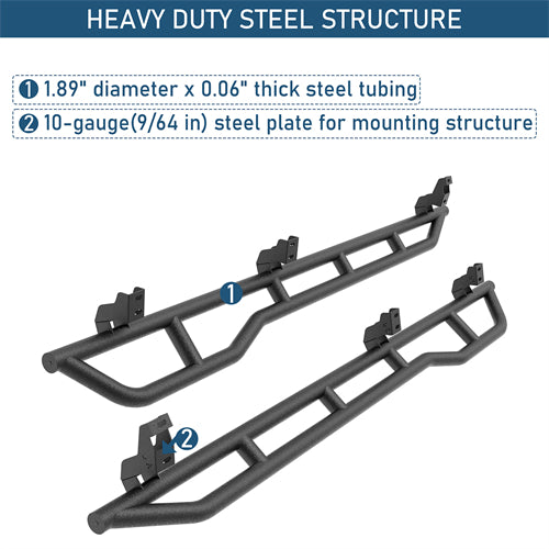 Heavy Duty Construction. Constructed from 1.89" diameter x 0.06" thick steel tubing, these Tube Slider Rocker Guards are built to handle demanding off-road conditions. The mounting structure is reinforced with heavy-duty 10-gauge (9/64 inch) steel plates for maximum strength and stability. Finished in a textured black powder coat and treated with a premium internal E-coating process, they offer excellent corrosion resistance and long-lasting durability on and off the trail.