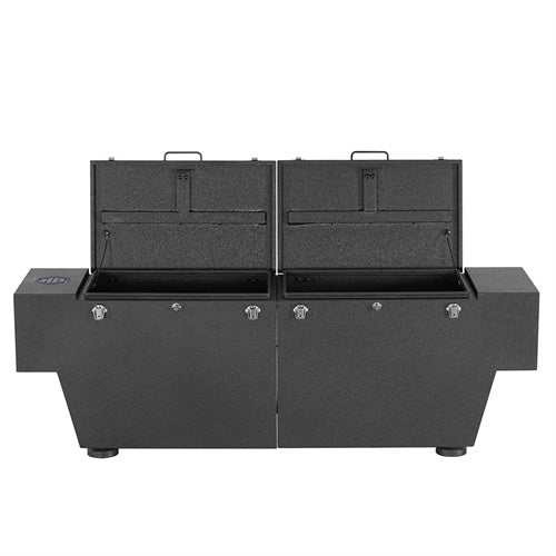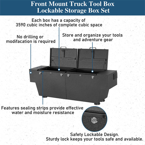 Massive Storage & Tool Organizer. The Front Mount Bed Tool Box Lockable Storage Box Set is a practical and rugged storage solution designed specifically for your trucks. With a spacious dual-box configuration, each unit offers 3,590 cubic inches of internal cubic space—ideal for storing recovery gear, tie-downs, hand tools, and other adventure essentials. The design not only maximizes the use of bed space but also brings an organized and purposeful look to the truck. The lockable latches on each box provide added security, while integrated sealing strips help keep water and moisture out, ensuring your gear stays dry and protected in all weather conditions.