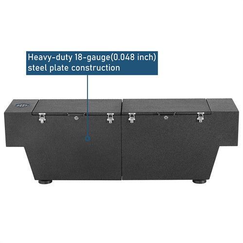 Solid Steel Construction. Crafted from durable 18-gauge (0.048-inch) steel plate, the storage boxes offer solid structural integrity for off-road and worksite use. The textured black powder coat finish adds a sleek, aggressive appearance while delivering scratch and corrosion resistance. An inner premium E-coating process further protects the steel from rust and extends the product's overall life.