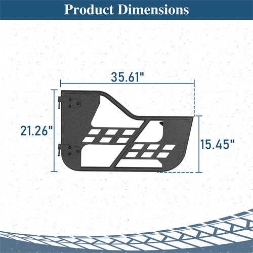 Tube Styling. The Tubular doors enhance the rugged look of your Wrangler, providing a distinctive off-road style. They offer open-air ventilation, allowing for a more exhilarating and immersive off-road experience. Designed with OE-like quality latches, these doors ensure secure locking to keep them firmly in place. And the nylon limiting straps prevent the doors from swinging too far open. These features combine to deliver both style and functionality for your off-road adventures.